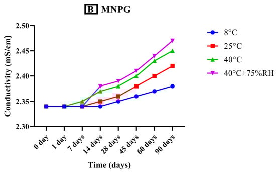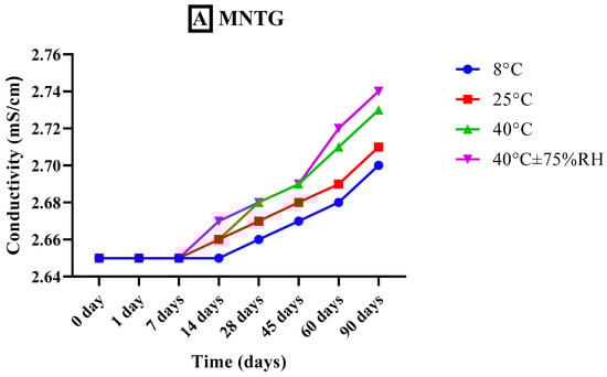 The conductivity measurements of both freshly developed transethosomal gel (MNTG) and plain gel (MNPG) formulations were taken with the aid of a conductivity meter (WTW COND-197i, Weilheim Germany) at specific time intervals (0, 1, 7, 14, 28, 45, 60, and 90 days) and at different storage temperatures e.g., 8 °C, 25 °C, 40 °C, and 40 °C ± 75% RH for whole study period of 90 days [29]. The conductivity meter probe was placed into the beaker containing the gel sample to measure the electrical conductivity of the gels. The electrical conductivity was recorded three times, and the mean was determined.