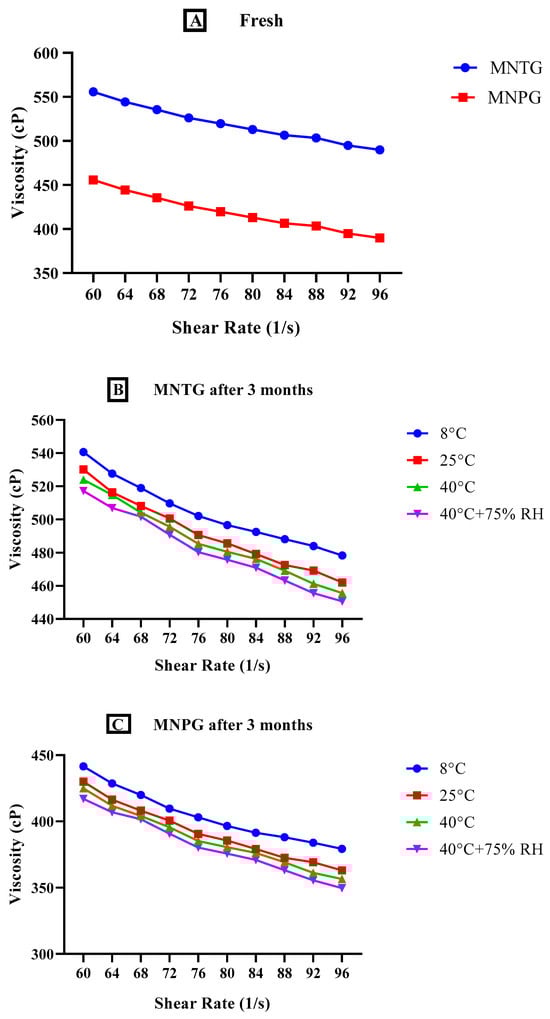 Rheological studies of MNTG and MNPG were performed at a temperature of 25 °C using a programmable Ultra Rheometer DV-III (Brookfield Engineering Laboratories, Middleborough, MA, USA) with spindle number CP41 and Rheocalc version 2.5.6, where the Software Rheocalc V-2.6 was used for examining the data. Studies of viscosity are crucial to evaluate a semisolid system’s stability. MNTG and MNPG were subjected to different temperatures e.g., 8 °C, 25 °C, 40 °C, and 40 °C ± 75% RH for 90 days to examine their thermal stability. The viscosity and shear rate of each sample were measured. The sample of each gel (0.5 ± 0.01 g) was put in a sample holding cup and spun between 20 and 100 revolutions per minute for analysis [29].