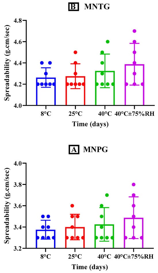The spreadability of MNTG and MNPG kept at different storage temperatures, i.e., 8 °C, 25 °C, 40 °C, and 40 °C ± 75% RH was determined using Milla’s approach at specific time intervals (0, 1, 7, 14, 28, 45, 60, and 90 days) for study period of 90 days [30]. Readings were taken in triplicate. On a glass slide, a two-centimeter circle was drawn, and it was filled with 0.5 g of gel. A second glass slide was positioned on top of the first one, and a 500 g of weight was placed on the upper slide. Any change in the circle’s diameter was then measured [29].