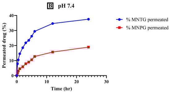 Ex vivo permeation was employed using the Franz cell method, where the MNTG (transethosomal gel) and MNPG (plain gel) were applied on the abdominal skin of Wistar albino rats, which is the most similar to that of human natural skin [33]. First, the rat skin was collected and cleaned with a regular saline solution. After carefully separating the fatty tissues, the skin was sliced into a circle to match the circumference of the Franz cell. Franz diffusion cell apparatus has a 1.73 cm2 surface area with a 12 mL receptor volume capacity. Phosphate buffer solution at pH 5.5 was supplied to the receptor compartment of the Franz cell apparatus to serve as the simulated skin media. The Franz cell maintained a temperature of 37 °C with regular stirring. About 1 g of each gel was placed on the rat’s skin and in the donor compartment. Frequent samples from the receptor compartment were taken out at 0, 0.25, 0.5, 1, 2, 3, 4, 5, 6, 12, and 24 h, followed by an immediate replacement with an equal volume of PBS to maintain sink conditions. Samples were examined at λmax = 272 nm using a UV-vis spectrophotometer (Bio-Tek Instruments, Bad Friedrichshall, Germany) to determine the total amount of permeated drug. The resulting data about drug permeability for MNTG and MNPG were plotted versus time [34]. The same methodology was carried out at pH 7.4 (blood pH) to ascertain the effects of pH on permeability.