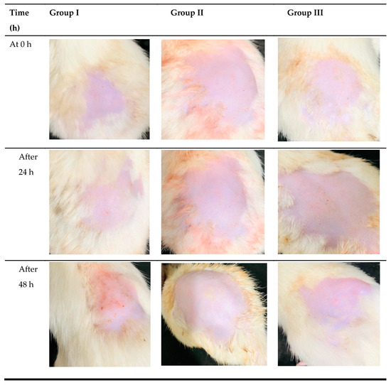 Before the study began, rat hairs were removed from the experimental site using a hair-removal cream. Approximately 0.5 g of each tested formulation was topically applied to the skin surface for each group of rats. The tested formulations were removed after 24 h, and the skin surface was cleansed using distilled water. After that, the experimental sites were checked for skin irritation at 0 h, 24 h, and 48 h [37,38]. The primary cutaneous irritancy index was assessed by combining the results for each group’s erythema and edema scores. For each animal, the observations were documented as scores in numbers [39]. Depending on the level of erythema/edema, the mean erythema/edema scores were recorded: absence of erythema/edema = 0, very slight erythema/edema = 1, slight erythema/edema = 2, moderate erythema/edema = 3, severe erythema/edema = 4.