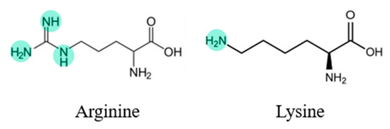 Acid–base interactions may lead to solubilities exceeding the pure low-solubility APIs [36]. Various studies have reported the enhancement achieved with formulations of acid-APIs combined with basic AA, such as arginine (ARG) and lysine (LYS), which have amino groups in their side chain (see Figure 2) [34]. These groups provide a basic reactivity toward the acidic functional groups of the selected API to form a salt. Regarding the formation of salts, according to Shemchuk et al. [36], a difference of 2 or more between the pKb (base) and pKa (acid) values may determine salt formation in binary formulations since the probability of a proton transfer is high, and salt formation is expected [20,36].