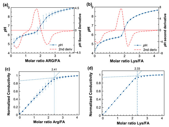 (a,b) potentiometric titration of FA with lysine (Lys) and arginine (Arg) and numerical second derivative of pH (red dashed line), respectively (c,d) conductimetric titration of FA with a concentrated solution of ARG and LYS, respectively; the extrapolation dashed lines cross at the molar ratio of maximum conductivity.