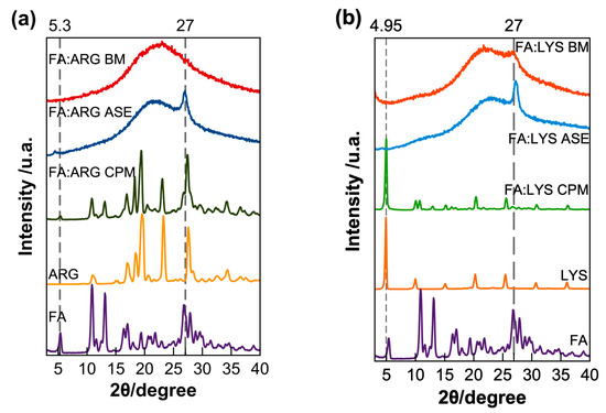 Figure 4 compares the diffraction patterns for the different FA formulations. It can be noticed that the diffraction pattern for the simple physical mixture (CPM) is equivalent to the sum of signals of each pure component. For the FA:AA-ASE formulation, a broad halo, characteristic of amorphous materials, is observed, except for a peak at 27° for both lysine and arginine (Figure 4). In the case of the ball milling formulations FA:ARG-BM, a complete amorphization was achieved after eight ball milling cycles of 15 min, while the formulation FA:LYS-BM was only amorphized after 14 cycles of 15 min but showed a broad peak at 27°, as observed in the systems prepared by solvent evaporation (ASE). The presence of this diffraction peak was previously observed, and it is interpreted, according to Magri et al., as a result of the self-assembly of dianionic folate ions through hydrogen bonds and π−π stacking [55].