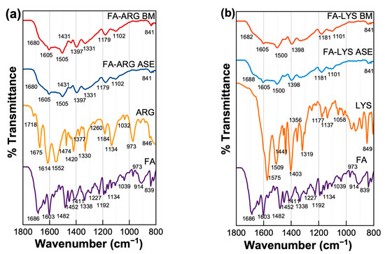 Infrared spectra of different FA formulations and pure components, (a) the FA:LYS systems and (b) the FA: ARG systems, are shown and obtained with Perkin Elmer spectrometer model Spectrum 100.