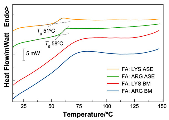 The thermal properties of the FA formulations were evaluated from 20 °C to 150 °C at a 10 °C/min heating rate, using simultaneous thermal analysis, i.e., differential thermal analysis (DTA) and thermogravimetric analysis (TG). The DTA thermograms for the ASE and BM systems are shown in Figure 7. FA-LYS ASE and FA-ARG ASE prepared by solvent evaporation present distinct glass transition steps with onsets at 51 °C and 58 °C, respectively, confirming their amorphous structure. On the other hand, the thermograms corresponding to the ball-milled formulations show a broad peak that extends from 50 °C to 75 °C. No crystallization processes are observed after the glass transition when heating up to 150 °C.