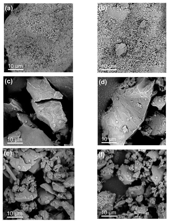 The morphology of the powders obtained from the different formulations was inspected under electron microscopy and shown in Figure 8. The physical mixtures of the crystalline FA and Lys (Figure 8a) and FA and Arg (Figure 8b) produce aggregates of particles of the order of 1 um. In the case of the binary systems obtained from solvent evaporation, both for FA-Lys (Figure 8c) and FA-Arg (Figure 8d), compact particles of the order of tens of micrometers are observed whose surfaces present typical fracture patterns of amorphous materials, consistent with the X-ray diffraction results, confirming that the binary systems amorphized as a result of the drying process. A similar morphology of amorphous particles is observed in the case of the binary systems obtained by ball milling, although in this case, the particle size is of the order or smaller than 10 um FA-Lys (Figure 8e) and FA-Arg (Figure 8f).