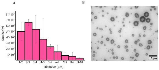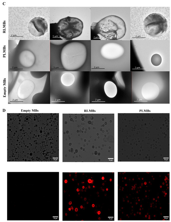 A BX50 Upright Microscope (ACH 60X/0.80 ∞/0.17 objective) and a Rolera Bolt CMOS QImaging Camera (Surrey, BC, Canada) were used to visualize and image RLMCs, respectively. To prepare RLMCs for imaging, they were diluted to a certain point (final concentration of 5 × 107 number/mL), pipetted on a 25 × 75 × 1 mm, and covered by a glass coverslip (Fisher Scientific, Waltham, MA, USA). The size distribution of RLMCs was investigated using a Multisizer 4e Coulter Counter (n = 3). Transmission electron microscopy (Jeol 1400+), with a voltage of 120 kV, was performed on RLMCs and empty MCs (control sample). Finally, 2 μL of a diluted sample was applied to a formvar-coated copper grid (Electron Microscopy Sciences) and dried using a nitrogen flow.
