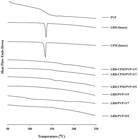 DSC thermograms of the amorphous LRD and co-amorphous LRD-CPM solid dispersions in comparison with the intact drugs and PVP.