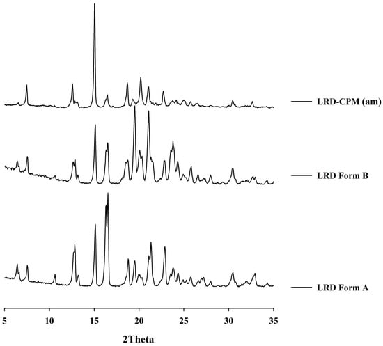 After all samples were kept in a desiccator cabinet at a temperature of 30 °C and 50% RH for 30 days, the XRPD patterns of some samples showed changes, as shown in Figure 3B. Crystalline peaks were observed in the XRPD pattern of co-amorphous LRD-CPM. The crystalline peaks detected at 2θ of 19.3, 20.2, and 24.1° were considered to belong to CPM. However, crystalline peaks at 2θ of 7.5, 12.6, 15.0, 16.2, 16.5, 18.7, 21.0, 22.7, 23.7, 30.4, and 32.6° were similar but not a complete match for the intact LRD. Two polymorphic forms (A and B) of LRD and their characteristics have been reported in US patent 20080194823A1 [29]. The intact LRD used in this study was in polymorphic form A. To clarify these crystalline peaks, LRD polymorphic form B was prepared according to a previous method [30]. The preparation was performed by slowly recrystallizing LRD from an amorphous LRD solution in a solvent mixture of methanol and water at a ratio of 20:80 for 10 h, after which it was filtered through a 0.22 µm filter membrane and dried in a desiccator at room temperature. The peak positions and intensities of the obtained recrystallized form B were compared with the crystalline peaks of the co-amorphous LRD-CPM stored for 30 days. The results showed that the peaks of the co-amorphous LRD-CPM matched those of LRD polymorphic form B, as shown in Figure 4.