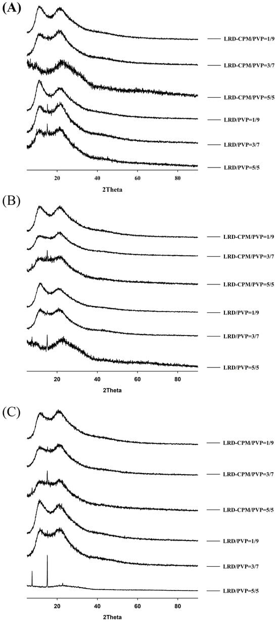 XRPD patterns of the amorphous LRD and co-amorphous LRD-CPM solid dispersions at 90 days (A), 180 days (B), and 360 days (C) of storage.