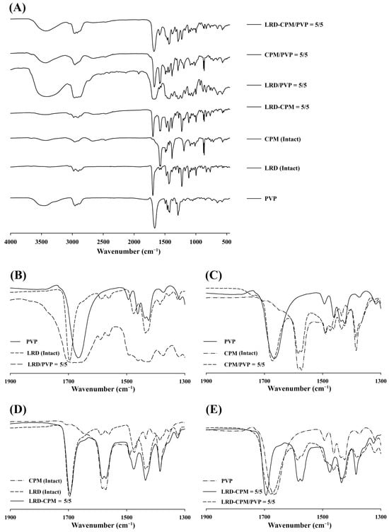 FT-IR spectra patterns of the co-amorphous LRD-CPM solid dispersions, CPM/PVP and LRD/PVP solid dispersions, and co-amorphous LRD-CPM mixture in comparison with the intact drugs and PVP (A) and wavenumber amplification in 1900–1300 cm−1 range of LRD/PVP solid dispersion (B), CPM/PVP solid dispersion (C), co-amorphous LRD-CPM mixture (D), and co-amorphous LRD-CPM/PVP solid dispersions (E).