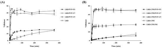 Dissolution profiles of LRD/PVP solid dispersions (A) and co-amorphous LRD-CPM/PVP solid dispersions (B) in comparison with intact LRD, co-amorphous LRD-CPM mixture, and LRD-CPM physical mixture in simulated intestinal fluid pH 6.8.