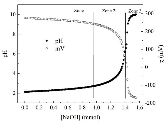 To determine the number of ionizable groups in the PEC molecule, a potentiometric titration was used. Briefly, 100 mg of PEC was dissolved in 100 mL of deionized water, and 10 mL of HCl 0.1 M was added to ensure that all PEC molecules were protonated. The potentiometric titration was performed by adding 0.1 mL of NaOH 0.1 M in intervals of 60 s, keeping the solution at room temperature (25 °C) and under gently magnetic stirring (100 RPM) using a pH meter GLP 22 (Barcelona, Spain) [41].