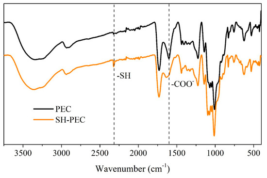 The success of the chemical modification of the PEC molecule with cysteamine was confirmed through FTIR-ATR. Figure 2 shows the FTIR-ATR spectra obtained for PEC (black line) and SH-PEC (yellow line). The PEC spectrum shows that the characteristic bands and peaks inherent to the PEC molecule distinguish a wide band around 3300 cm−1 attributed to the -OH stretching of carboxylic acid. The peak showed at 1730 cm−1, corresponding to the stretching bond of the -C=O of the methyl esters of the carbonyl groups, and the peak at 1600 cm−1 is assigned to the asymmetric tension of -COO−. On the other hand, the SH-PEC FTIR-ATR spectrum contrasted significantly from that of PEC. A new peak located at 2300 cm−1 was assigned to the -SH groups indicating that cysteamine residues have been chemically attached to the PEC [47]. Additionally, the 1600 cm−1 band in the SH-PEC spectrum shows a small shoulder at 1630 cm−1, indicating the formation of secondary amide groups, a result of the chemical reaction between the -NH2 of the cysteamine and -COOH groups of the cysteamine and PEC [48].