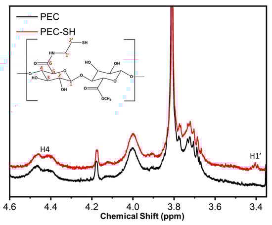 Figure 3 shows the 1H NMR spectra recorded for both PEC (black line) and SH-PEC (red line). The 1H NMR spectrum for native PEC displays a complex set of signals ranging from 3.78 to 3.65 ppm. Signals corresponding to esterified methoxyl groups and the H2 of galacturonic residues appeared at 3.77 and 3.70 ppm, respectively [43]. The double peak observed between 4.45 and 4.35 ppm can be assigned to the H4 of galacturonic acid (4.40 ppm) and esterified galacturonic acid residues (4.46 ppm) [49]. In contrast, the SH-PEC spectrum exhibits a triple signal at 3.40 ppm, which corresponds to the protons of cysteamine (tagged as H1′) [50]. To determine the degree of substitution for PEC, the area ratios of H1′ and H4 (4.40 ppm) [43] was considered, resulting in a DS of 6.9%.