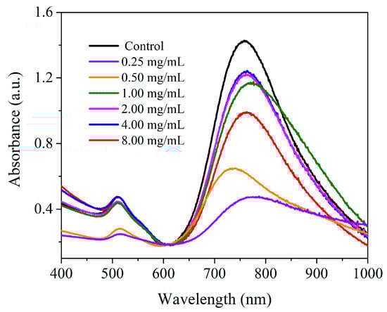 The role of SH-PEC as a stabilizer agent for AuNR was assessed by UV-Vis absorption spectroscopy. In this regard, different amounts of SH-PEC (0.25–8.0 mg/mL) were added to an AuNRs solution (1.12 × 10−9 M) with the aim of determining the optimal concentration of SH-PEC needed to get stable AuNRs. The UV-Vis absorption spectrum in Figure 4 shows the typical spectral features of CTAB-stabilized AuNRs, distinguishing two characteristic absorption bands, one located at a maximum wavelength (λmax) of 450 nm corresponding to the TSPR, and a second one located at around 780 nm corresponding to the LSPR. However, spectra recorded for AuNRs stabilized with SH-PEC depicted important changes in TSPR and LSPR at certain SH-PEC concentrations. At 0.25 mg/mL (purple line) and 0.5 mg/mL (dark blue line) of SH-PEC, the absorption intensity diminished for both TSPR and LSPR, and a blue shift in the λmax of LSPR were denoted, suggesting that the structure of AuNR is lost due to the fact that the amount of SH-PEC is too low to cover and stabilize the surface of the nanorods. The AuNR@SH-PEC stabilized with 1.0 mg/mL of SH-PEC (green line) resulted in stability in aqueous media; however, a slight broadening of the LSPR was observed due to the formation of small clusters of AuNR@SH-PEC, suggesting that the SH-PEC amount added to stabilize the AuNR solution was in the threshold to cover the surface of the AuNRs. Interestingly, the absorption spectra recorded for AuNR@SH-PEC stabilized with SH-PEC at concentrations of 2.0 mg/mL (pink line) and 4.0 mg/mL (blue line) showed that the transversal and longitudinal SPRs are localized at the same λmax shown by AuNRs stabilized with CTAB, albeit the absorption intensity diminished due to the biopolymeric coating. Finally, the spectrum recorded for the AuNR@SH-PEC stabilized using 8.0 mg/mL of SH-PEC (red line) shows a decrease in the absorption intensity of both TSPR and LSPR; this could be due to the increased thickness of the polymeric coating on the surface of AuNRs. All these results were corroborated by dynamic light scattering (DLS) and Zeta potential (ζ) experiments.