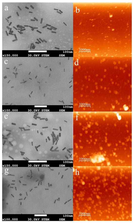 STEM and AFM images of AuNR@SH-PEC; (a,e) 8.0 mg/mL SH-PEC, (b,f) 4.0 mg/mL SH-PEC, (c,g) 2.0 mg/mL SH-PEC, (d,h) 1.0 mg/mL SH-PEC.