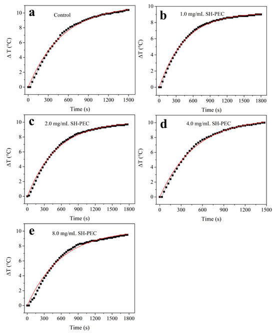 Photothermal conversion efficiency adjustments of AuNR@SH-PEC with different SH-PEC concentrations, (a) AuNRs control with CTAB, (b) 1.0 mg/mL, (c) 2.0 mg/mL, (d) 4.0 mg/mL, (e) 8.0 mg/mL.