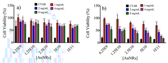 Cell viability assays of (a) fibroblasts Balb/c 3t3 cell line and (b) cervical cancer HeLa cell line in the presence of AuNR@SH-PEC irradiated with an 808 nm laser (1 W). *** p < 0.001; ** p < 0.05; * p < 0.05; ns indicates no significant difference vs. CTAB.