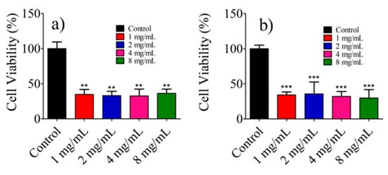 Then, the photothermal effect of gold nanorods on the viability of Balb/c 3t3 and Hela cells was assessed using a concentration of 6.25 × 109 AuNR@SH-PEC/mL, irradiating with a CW laser (808 nm, 1 W). As depicted in Figure 10, both Balb/c 3t3 and HeLa cells subjected to laser irradiation exhibited a significant reduction in cell survival percentage. This outcome underscores the effectiveness of AuNR@SH-PEC in killing cells, supporting its potential as a photothermal system against cancer, in line with the proposition made earlier by Arellano-Galindo [54].