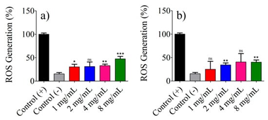 ROS production by (a) fibroblast Balb/c 3t3 cell line and (b) cervical cancer HeLa cell line irradiated with 808 nm laser (1 W) in presence of AuNR@SH-PEC. *** p < 0.001; ** p < 0.05; * p < 0.05; ns indicates no significant difference vs. Control (−).