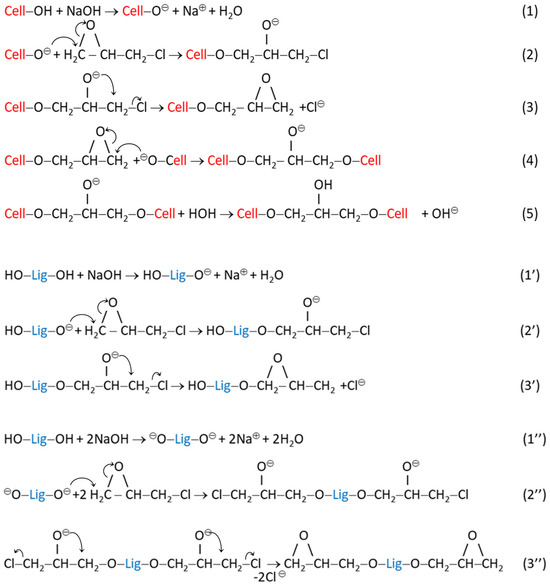 The proposed mechanism of the cross-linking reaction of cellulose with LE, in the presence of ECH: (1)–(5)—possible cross-linking reactions between cellulose (Cell) and ECH; (1′)–(3′) and (1’’)–(3’’)—chemical reactions between lignin (Lig) and ECH; (4′)–(5′) and (4″)–(5″)—possible cross-linking reactions between and Cell, LE and ECH.
