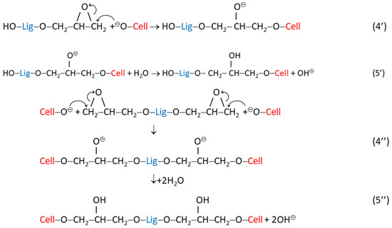 The next reactions, (1′)–(3′) and (1″)–(3″), prove the chemical modification of lignin macromolecules (Lig) by introducing multiple epoxy groups, but also by preserving some unreacted OH groups.
