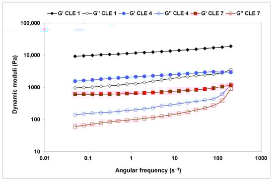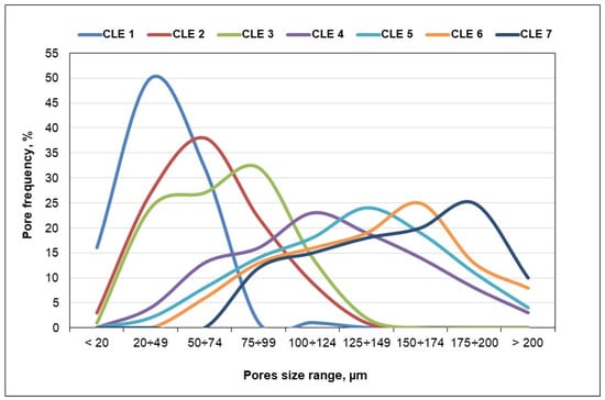 Figure 5 shows the pore size distribution for CLE hydrogels. It can be observed that, as the LE content increased in the CLE hydrogels, a wider distribution of the pore size was registered (CLE 4–CLE 7), compared to those containing a smaller amount of LE (CLE 1 and CLE 2). For example, if, for CLE 1, the pore size frequency is concentrated in a small size range, between 20 and 75 µm, in the case of sample CLE 7, this range widens, starting from 75 µm and continuing up to approximately 275 µm, with a maximum size located in the range of 175–200 µm. In fact, with the increase in the LE content in the hydrogel, the size range moves to the right with the greater pore frequency, to larger sizes, with approximately 25 µm for every 5% addition of LE in the formula.