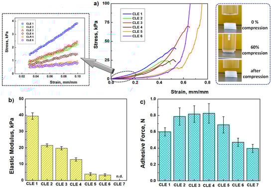 The compressive test was performed with CLE hydrogels of rectangular shape (20 mm length, 11 mm width, and 9 mm high) at room temperature. The samples were saturated with PBS of pH 5.5 for two hours, then placed between two parallel plates and tested under uniaxial compression till 70% deformation, using a 4500 g load cell and 0.2 mm/s test speed.
