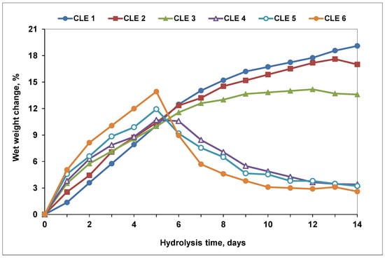 The Qeq determined for never-dried hydrogels varies from 1920% for CLE 1 up to 10.265% for CLE 7. In addition, the Qmax is improved from 1460% for CLE 1 up to 5490% for CLE 7. It should be noted that CLE hydrogels exhibited a significantly higher swelling capacity than the CL hydrogels reported earlier in the literature [17], suggesting that the use of LE in the preparation of CLE hydrogels greatly improves the capacity for water absorption. Furthermore, if LE is used in the preparation of hydrogels together with poly(vinyl alcohol) (PVA), the same tendency of increasing an Qmax with increasing LE content within the hydrogel is observed, but the Qmax values recorded for LE hydrogels–PVA are significantly lower than those obtained in this study [27].
