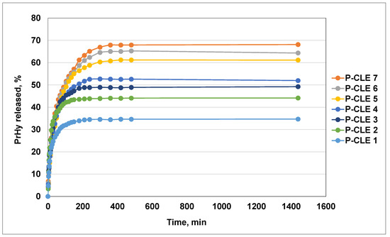 The PrHy release profiles indicate for all P-CLE hydrogels a prolonged release of the drug, which increases gradually until about 400 min, where a plateau is reached. The drug is constantly released until 1440 min. There is an obvious influence of the LE content of P-CLE hydrogels on the PrHY release process; more precisely, the increase in the LE content within the matrix determines an increase in the amount of PrHy released. In this regard, it is observed that 68% PrHy is released from the P-CLE 7 hydrogel (with the highest amount of LE), in comparison with 34% PrHy released from the P-CLE 1 hydrogel, whose composition is based only on cellulose.