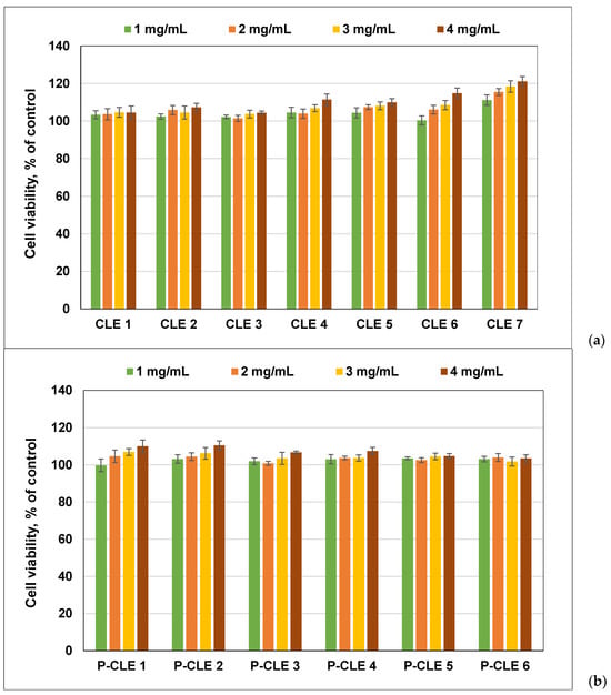 Considering that none of the tested extract dilutions decreased the cell viability to below 99%, according to the international standard ISO 10993-5:2009 [21], it can be concluded that all CLE and P-CLE hydrogels can be regarded as non-cytotoxic materials.