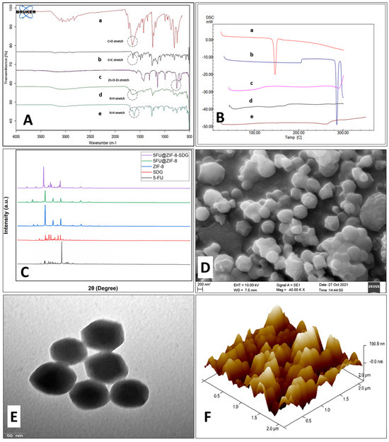 Characterization of MOFs. (A) presents the FTIR spectra of different samples: (a) 5−FU, (b) SDG, (c) ZIF−8 MOFs, (d) 5−FU@ZIF-8 and (e) 5−FU@ZIF-8-SDG Complex. (B) represents DSC thermograms of different samples: (a) SDG, (b) 5−FU, (c) ZIF−8 MOFs, (d) 5−FU@ZIF-8, and (e) 5−FU@ZIF−8−SDG MOFs. (C) represents the XRD pattern of different samples. (D) presents an SEM image of ZIF−8 MOFs at the 200 nm scale. (E) presents a TEM image of ZIF−8 MOFs at the 50 nm scale and (F) represents an AFM image of ZIF−8 MOFs representing the surface roughness. * in figure over “nm” is to denote that “nm” stands for nanometer.