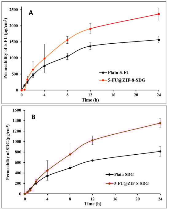 Ex vivo permeation study. (A): Permeability of 5-FU from plain drug dispersed gel and 5-FU@ZIF-8-SDG MOF gel formulation at pH 6.8. (B): Permeability of SDGs from the plain drug dispersed gel and 5-FU@ZIF-8-SDG MOF gel formulation at pH 6.8. All the points in the graph are presented as Mean ± SD (n = 3).