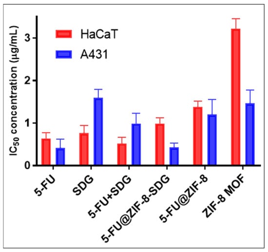 The cytotoxicity of SDG, 5-FU, 5-FU+SDG, ZIF-8 MOFs, 5-FU@ZIF-8 and 5-FU@ZIF-8-SDG MOFs was evaluated in HaCaT and A431 cells (Figure 4). After incubation for 48 h, the 5-FU@ZIF-8-SDG MOFs showed lower cytotoxicity (based on the IC50 values) than the plain drugs or drug combination on HaCaT cells. However, the opposite was observed in A431 cells, wherein 5-FU@ZIF-8-SDG MOFs showed the highest toxicity compared to plain drugs and drug combinations. The ZIF-8 MOFs show negligible cytotoxicity in both cells. Given that HaCaT cells represent normal skin cells and A431 cells represent skin cancer cells, the 5-FU@ZIF-8-SDG MOFs are more toxic to skin cancer cells than to normal cells. Furthermore, we can conclude that 5-FU is slowly released from the MOFs, making it possible to deploy them as effective drug delivery systems against skin cancer.