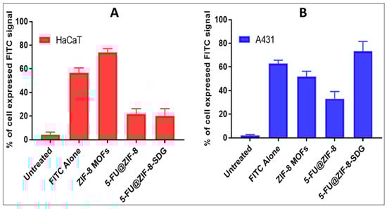 Cellular uptake studies for plain FITC, ZIF-8 MOFs, 5-FU@ZIF-8 and 5-FU@ZIF-8-SDG MOFs were performed on HaCaT and A431 cells, as shown in Figure 5A,B. The observations strongly suggest that the test compounds (ZIF-8 MOFs, 5-FU@ZIF8 MOFs and 5-FU@ZIF8-SDG MOFs) considerably expressed the FITC signal in HaCaT and A431 cells and confirmed good cellular uptake in both cells. However, when comparing the cellular uptake of the two cells, the 5-FU@ZIF8-SDG MOFs showed higher uptake in the A431 cells due to the presence of SDG on the surface of 5-FU@ZIF8-SDG MOFs, which tends to bind to SMO receptors present on the A431 cells. The absence of SMO receptors on HaCaT cells leads to less cellular uptake compared to A431 cells.