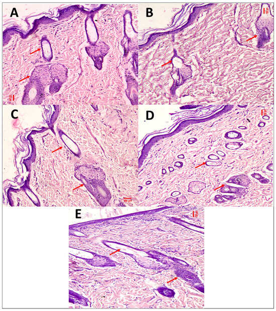 The gel-treated skin area was also subjected to histopathological examination using haematoxylin (H) and eosin (E) staining and was observed for inflammation and oedema. The histopathological scoring was performed as follows: slight = +, moderate = ++ and severe = +++ [40,41].