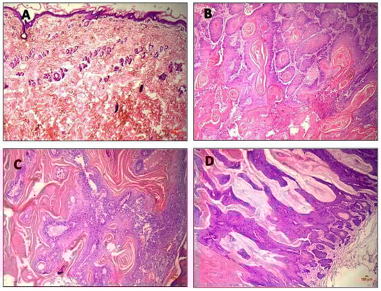 - Induction of cancer (BCC) in animal model: 7,12-Dimethyl-benzanthracene solution (1% w/v) was freshly prepared in acetone for the induction of BCC in male Wistar rats. Approximately 200 µL of this freshly prepared 1% DMBA solution was topically added to the shaved area of the rat skin and exposed to UV light at a wavelength of 311 nm for 1 min every other day for a period of 3 months. After 3 months of visualization of BCC induction, the skin was excised, and the processed portion of the skin was fixed in Bouin’s fixative and taken for histopathological examination. Hematoxylin and eosin were used for staining, and the pathological changes observed were viewed under a light microscope. Untreated skin was considered the negative control, and skin treated with 1% DMBA along with UV exposure was considered the positive control. The skin sections were observed for dermal masses composed of lobules and cords of tightly crowded cells that were sustained by a fluctuating fibrovascular stroma to confirm BCC induction. Tumor cells from surrounding nests with central necrosis confirm the solid type of BCC induction [42]. The efficacy of the formulations was assessed by visual observation of the BCC-induced area of the skin, histopathological studies of the skin, immunohistochemistry, and protein expression studies by Western blot analysis.