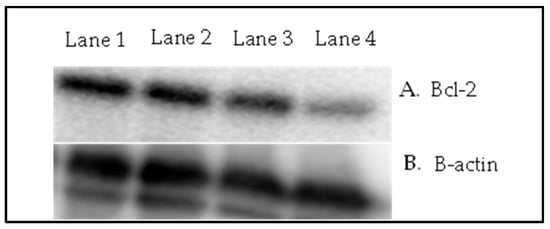 Because there was no significant reduction in the BCC area in the other treatment groups, in the Western blot analysis, we focused only on three treatment groups, i.e., Group 5 (plain 5-FU & SDG gel), Group 8 (5-FU@ZIF-8-SDG gel) and Group 9 (marketed formulation), along with one disease control Group 2 (disease induced no treatment). The immunoblot analysis showed a higher intensity of Bcl-2 protein expression in Group 2 (Lane 1) than in Group 5, Group 8 and Group 9. Lanes 2 and 3 represent plain 5-FU & SDG gel and marketed formulation treated groups, respectively, showing the comparatively higher expression of Bcl-2 proteins. Lane 4, i.e., the 5-FU@ZIF-8-SDG gel-treated group, showed relatively low intensity Bcl-2 protein levels, confirming the effectiveness of the formulation. The results of western blot analysis are depicted in Figure 10.