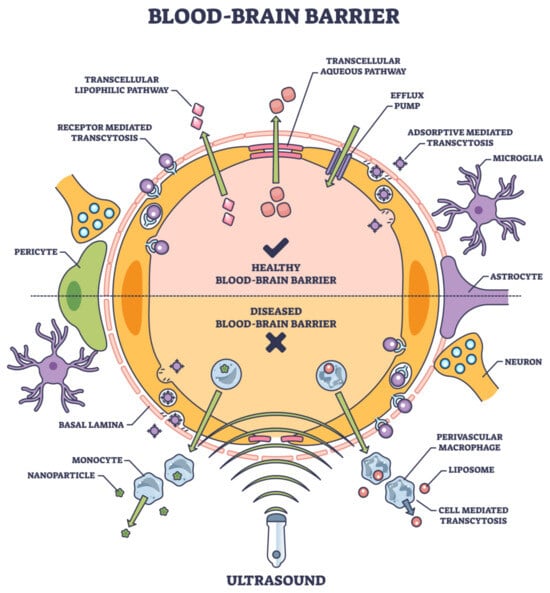 Protecting the brain from toxins, pathogens, and other foreign substances is crucial for survival. Thus, the BBB has evolved to become a gatekeeper, ensuring that only substances beneficial or neutral to the brain’s function gain entry [8]. However, this protective shield also presents a significant challenge for medical science, particularly neurology and psychiatry [9]. Most drugs designed to target the brain—whether for the treatment of neurodegenerative diseases, psychiatric disorders, or brain tumors—cannot cross the BBB in therapeutically effective dosing [10], leading to numerous potential treatments failing in the clinical stages, not necessarily because the drugs are not efficacious, but because they cannot reach their intended site of action in the brain [11]. Thus, the BBB represents a double-edged sword. While it is indispensable for physiological well-being, it is also one of the most formidable obstacles in treating neurological diseases [12].