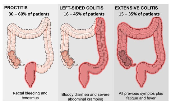 Ulcerative colitis (UC) was recognized as a disease for the first time in 1859 by Samuel Wilks [23]. It is characterized by diffuse inflammation of the large intestine, restricted to the mucosa and submucosa and limited to the colon and rectum. The mucosal involvement is continuous and ascending, and the transition between affected and normal tissues is well demarcated [24]. The classification of UC varies according to the symptomatology, as shown in Figure 1. Depending on the extent of the affected colon, colitis is classified as proctitis or left colitis, with both conditions affecting parts of the colon, or pancolitis, affecting the entire colon. Proctitis affects around 30 to 60% of patients with UC and left colitis is observed in range between 16 and 45% of the affected people. Proctitis is the situation in which colitis affects the rectum, associated or not with rectal bleeding and tenesmus. Left-side colitis can affect the rectum and the sigmoid and descending colon, and is associated with bloody diarrhea and severe abdominal cramps. Finally, extensive colitis (or pancolitis) is the condition in which colitis affects the whole organ and is present in 15 to 35% of patients. It includes all the above characteristics plus fatigue and fever [25].