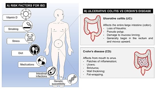 The main diseases classified as IBD are ulcerative colitis (UC) and Crohn’s disease (CD) [1,2], both characterized by the chronic relapse and remission of inflammation in the GIT [22]. These two subtypes differ in the extension of affected regions and the most common symptoms.