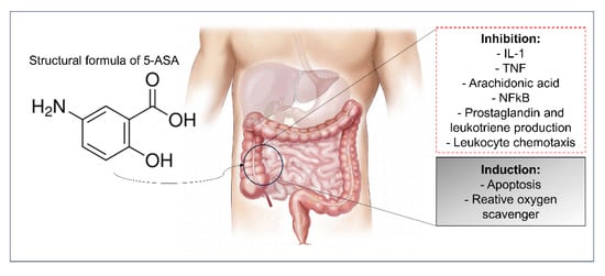 5-aminosalicylic acid, also known as 5-ASA or mesalazine and belonging to the aminosalicylates class, is the drug of first choice for the treatment of mild to moderate IBD [60]. The structural formula and mechanism of action of 5-ASA is shown in Figure 3.