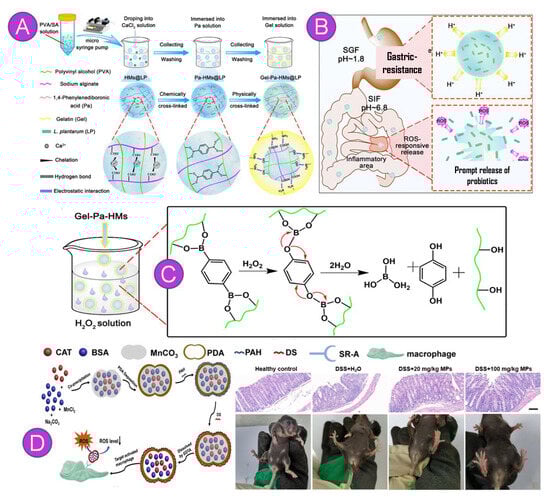 Recently, Zhu et al., 2022 [129] reported that during IBD a key target for the release of probiotics would be in specific regions of high production of reactive oxygen species (ROS, up to 0.1 mM). The authors designed a system of ROS-sensitive microbeads with alginate/polyvinyl alcohol (PVA)-based 1,4-phenyleneboronic acid (Pa) embedded in a gelatin-based gel (Figure 4A). The results showed an encapsulation efficiency above 95%, nontoxicity, and the ROS-triggered release of highly active Lactobacillus plantarum in intestinal inflammatory sites (Figure 4B). This effect occurred due to reversible reactions formed between PVA (1,2 diol free groups) and Pa (compounds derived from boronic acid and boronate esters) which, in turn, when they come into contact with hydrogen peroxide, are capable of breaking down and effectively releasing the active compound (Figure 4C) [130]. Similarly, polydopamine and catalase, considered powerful antioxidants against free radicals, were used to fabricate ROS scavenging microparticles via coprecipitation and self-polymerization. Dextran sulfate was further applied to modify the microparticles’ surface considering its targeting ability toward activated macrophages. Results showed the preparation of 1.1 µm microparticles with excellent ROS scavenging ability in cell experiments and a 40% reduction in disease activity index scores in animal experiments (Figure 4D) [131].