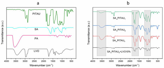 FTIR spectra of (a) precursor (SA, PA, and PITAU) and (b) hybrid hydrogels.