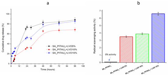 (a) Cumulative drug release curve of LVO-loaded hydrogels; (b) radical scavenging activity of LVO-loaded hydrogel and oil-free SA_PITAU3 hydrogel.