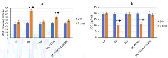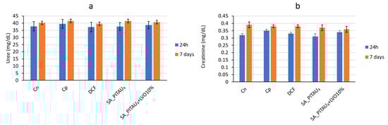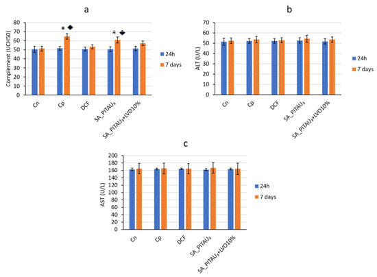 The following determinations were made: white blood cell percentage (polymorphonuclear neutrophils (PMN), lymphocytes (Ly), eosinophils (E), monocytes (M), and basophils (B)—described in the Supplementary Material, Figures S4–S6), fibrinogen and C-reactive protein, the activity of liver enzymes: aspartate aminotransferase (AST) and alanine aminotransferase (ALT), kidney function: serum urea and creatinine levels, immune parameters: serum complement (C) [58], serum levels of tumor necrosis factor alpha (TNFα) and interleukin 10 (IL-10), and assessment of oxidative stress through measuring superoxide dismutase (SOD) [59] and malondialdehyde (MDA) activity [60].