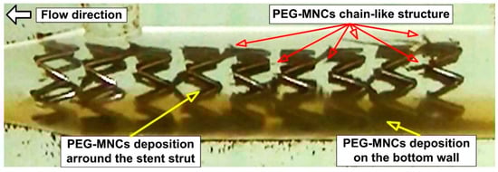 In our previous work [21], the magnetic nanoclusters produced chain-like structures in a stented vascular model during the stent targeting process (Figure 1). These magnetically built structures around the stent geometry have a significant length at the end of the targeting, with an average chain size of 0.56 mm. Removing the magnetic field at the end of the targeting procedure did not affect the spontaneous disintegration of the produced filaments into a small structure or cluster the same size as those in the injected suspension.