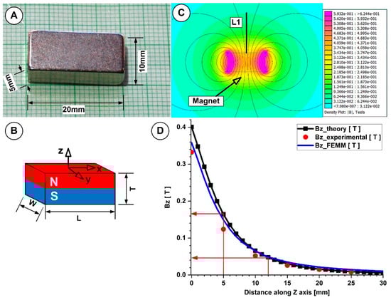 A magnetic field generated with the NbFeB52 permanent magnet was used in the experimental investigation. (A) The dimension of the used magnet and axis association. (B) A used permanent magnet has polarization along the Z-axis. (C) Numerical investigations of the magnetic field generated with the NdFeB52 magnet. (D) Bz evolution function of the magnet surface distance. Comparison between theoretical, experimental, and numerical results.